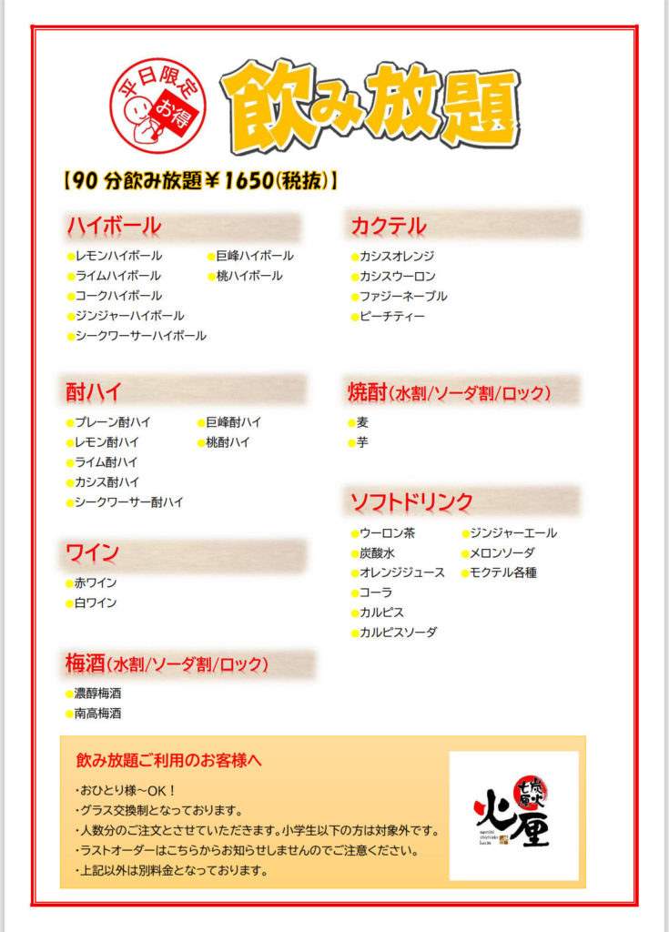 コース・セットメニュー コースの方限定で+1500円で飲み放題に出来ます!(90分)コースご予約時もしくはご来店時にお申し付けください!後からの飲み放題の追加は、お時間の都合上出来ませんのでご了承くださいませ! 単品飲み放題 90分 コースメニュー お手軽コース ¥3,980 付き出し塩キュウリ大根サラダスープ上カルビ上ハラミ豚トロ阿波尾鶏ももごはん(大・中・小選択) 火厘コース ¥4,980 付き出し大根サラダ塩タン上カルビ上ハラミホルモン4種(ホソ・レバー・ハツ・センマイ)阿波尾鶏海鮮チヂミ豚トロごはん(大・中・小選択)バニラアイス 贅沢コース ¥5,980 食前酢(ザクロ酢)付き出し塩キュウリ大根サラダキムチ盛り合わせ(白菜キムチ・オイキムチ・カクテキ)スープ塩タン匠ロース匠カルビ匠ミスジ阿波尾鶏もも海鮮チヂミごはん(大・中・小選択)バニラアイス ※コースは予約制(前日まで)とさせていただいており、2名様からの同一コースおよびご来店人数での受付となります!※小学生はコースの人数には含まれません。 予約時にお申し出ください!※お時間は120分で、飲み放題90分のラストオーダーは5分前にお伺いさせていただきます!※飲み放題のご注文は、ご来店人数分とさせていただいております。 飲み放題のご注文は空ラグラスと交換でお願いします。※全て税抜価格です。 セットメニュー 極上匠セット ¥6,480 匠ロース匠カルビ(2人前)匠ミスジ匠塩タン薄切り 火厘セット ¥4,580 塩タン上ハラミ上カルビ上ロース豚トロ阿波尾鶏ももウィンナー ホルモンセット ¥1,980 ホソハツセンマイレバー サプライズセット ※完全予約制とさせていただきます!お客様からのリクエストで生まれたサプライズセット!!目上の方や大切な人、恋人などへのサプライズにいかがでしょうか?? 肉ブーケ塩タン・上カルビ・上ロース・豚バラなどで作成! ¥3,980 肉ケーキセット ¥4,980 お祝いプレート4種類のアイスをベースに作成! ¥1,800